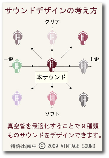 上述したサウンド変数のうちプリ管のゲインと、パワー管のパワーに着目して、サウンドをコントロールするという考え方が、ヴィンテージサウンドがご提案している真空管によるサウンドデザインです。